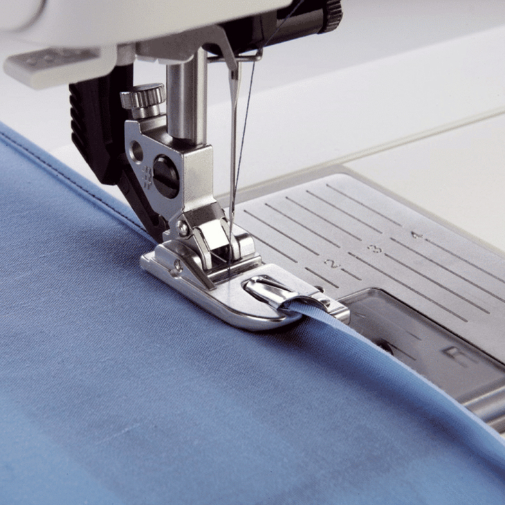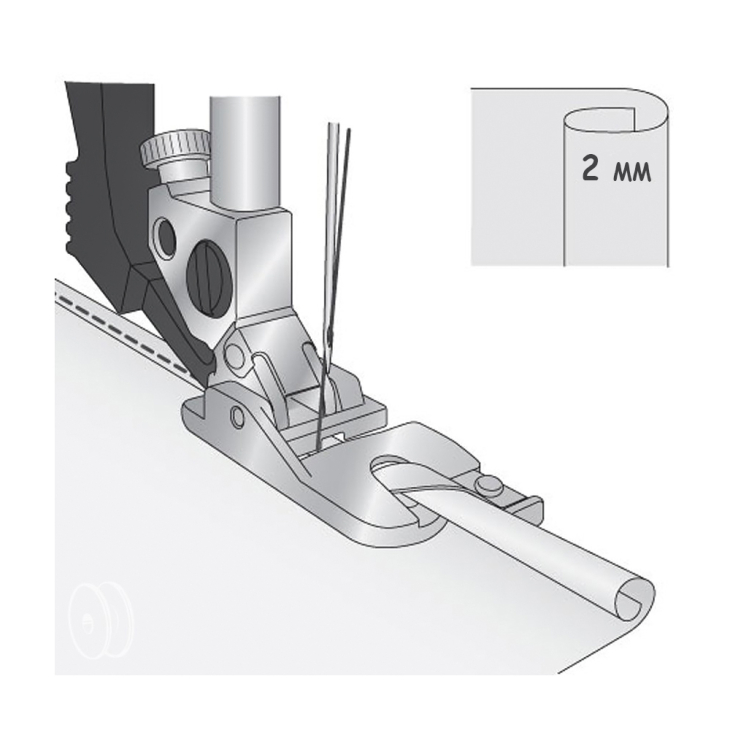 1. Выбрать прямую строчку. Загладить начало будущего шва на ширину 2 мм. Уложить завернутый край под лапку и сделать несколько стежков. Оставить иглу в ткани для ее фиксирования. Поднять лапку и ввести край ткани в завивающее устройство лапки. Опустить лапку и продолжить шитье, направляя край ткани.