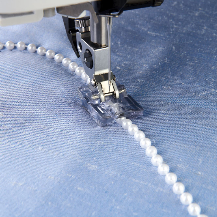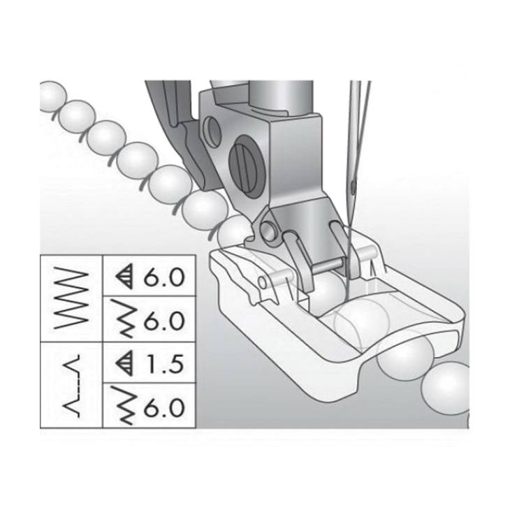При помощи этой лапки вы сможете украсить любое изделие нитями бисера или жемчуга. Бусинки будут легко проскальзывать под лапкой в процессе пришивания.