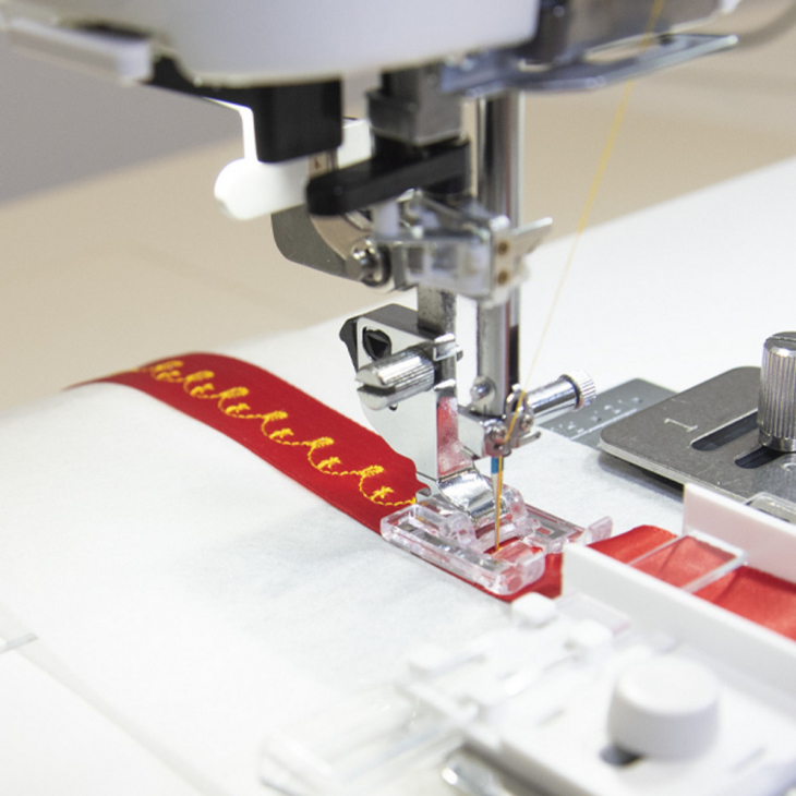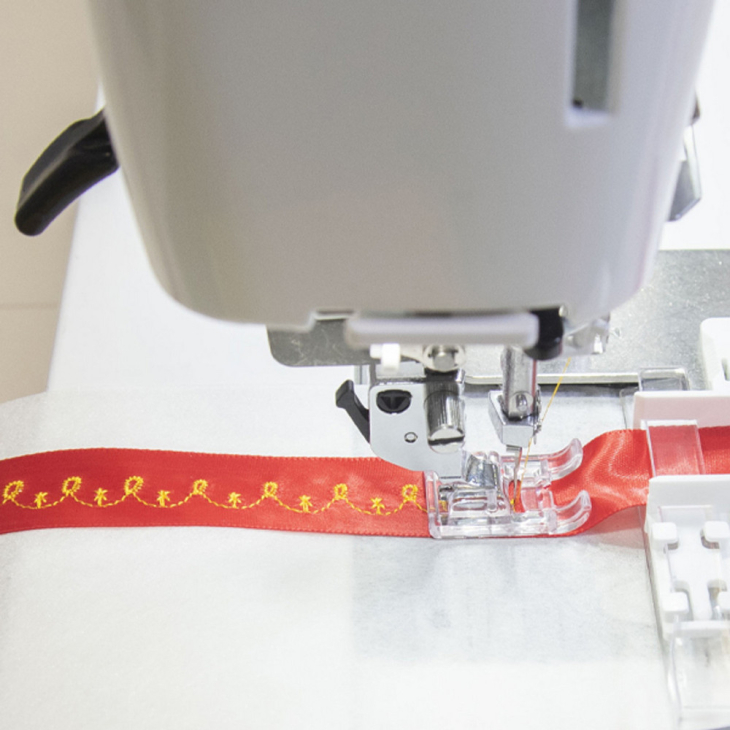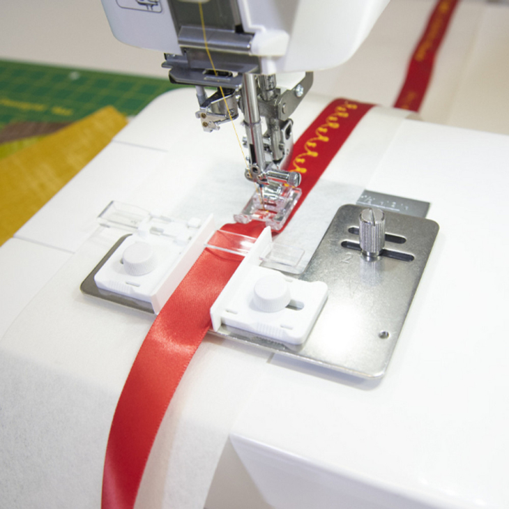 Направитель для декорирования ленты поможет создать оригинальные ленты, добавляя к ним декоративные строчки или буквы. Конструкция направителя позволяет легко его устанавливать, а прозрачный направитель на нём помогает точно контролировать шитьё. Добавьте больше индивидуальности в ваши проекты.
