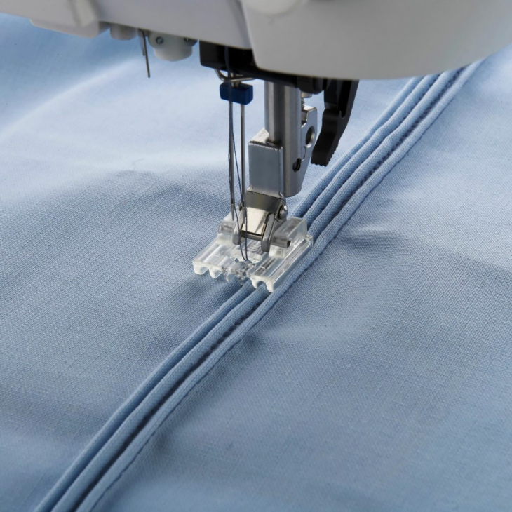 За допомогою подвійної голки та цієї лапки з жолобками на підошві ви зможете створювати защипи, паралельні один одному. Жолобки будуть служити направляючою, завдяки чому защипи виконуватимуться паралельно один одному навіть на відстані. Ви можете використовувати цю лапку для роботи з бавовною, легкою шерстю або іншими тонкими тканинами.