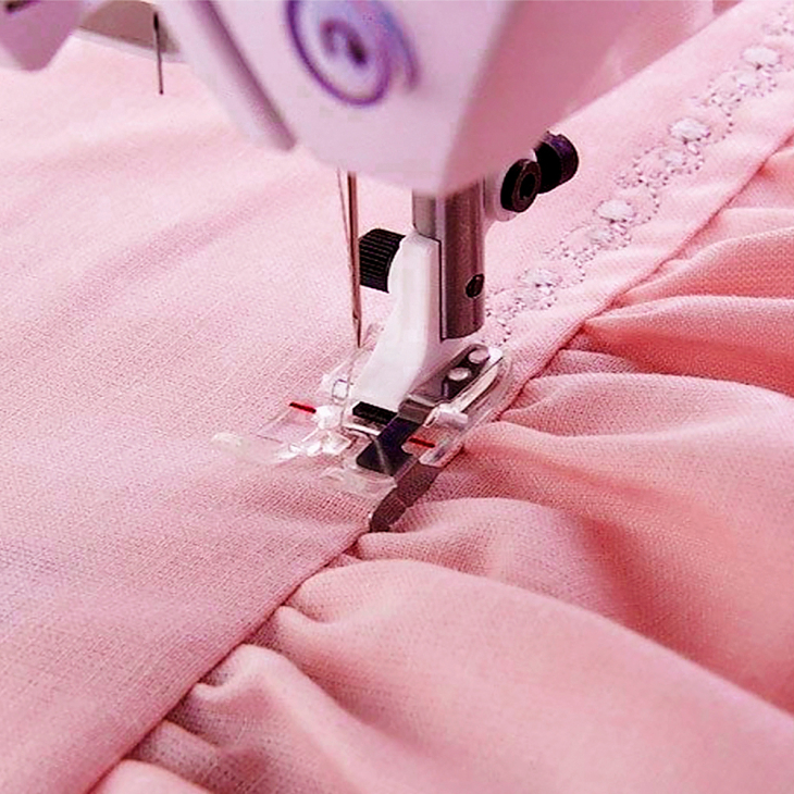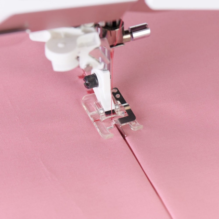 Прозора лапка з правою направляючою дозволяє виконувати рівну декоративну строчку, а виступ на краю лапки допомагає підтримувати однакову відстань між краєм тканини та строчкою.