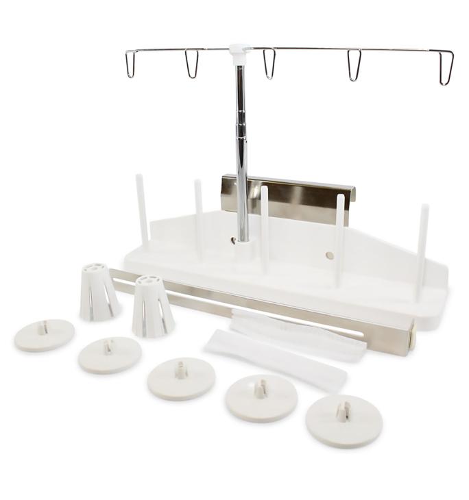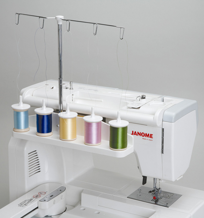 Стійка для 5 котушок легко кріпиться на вишивальну машину Janome. Коли кольори у вишивці багаторазово повторюються, для безперебійного шиття використовується ця стійка, яка суттєво скоротить час для зміни кольорів.
