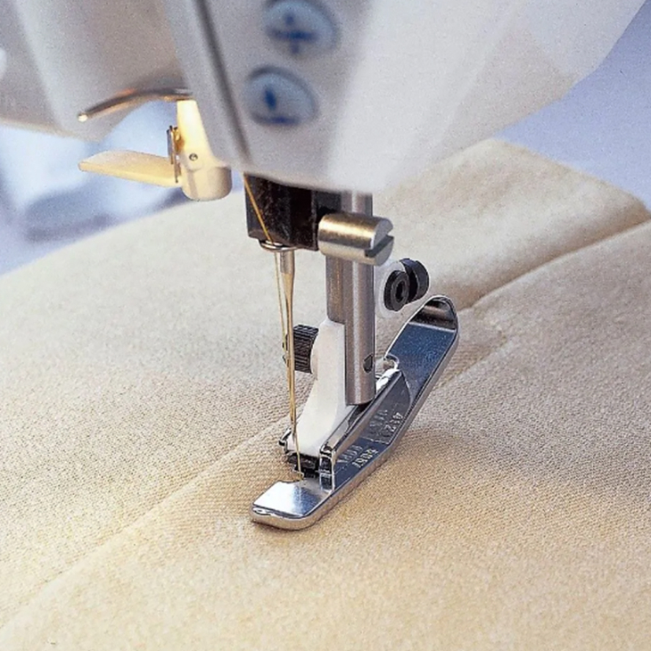 Використовуйте вузьку лапку для пришивання блискавки, стрічок, тасьми, смужок і т.д. Лапку можна встановити ліворуч або праворуч від голки.